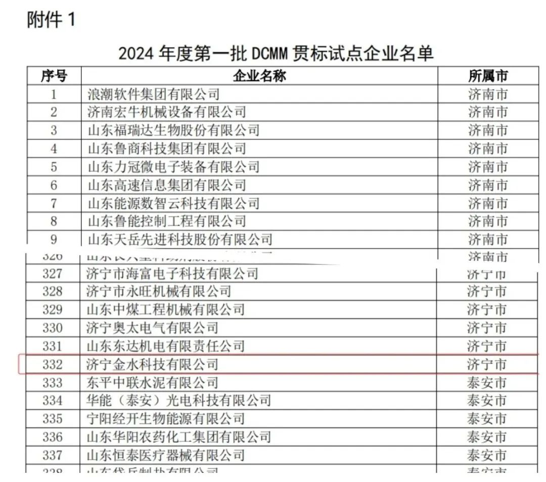 近日,山東省工業(yè)和信息化廳公布2024年度第一批DCMM貫標(biāo)試點企業(yè)名單,濟(jì)寧金水科技有限公司被列為試點企業(yè)之一。