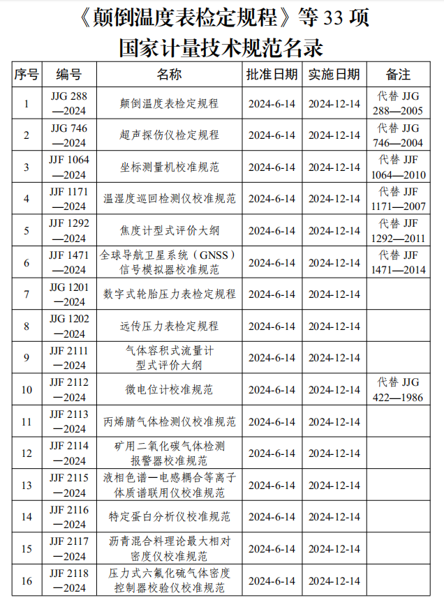 【儀表網 行業(yè)標準】根據《中華人民共和國計量法》有關規(guī)定,市場監(jiān)管總局批準《顛倒溫度表檢定規(guī)程》等33項國家計量技術規(guī)范發(fā)布實施。實施時間2024年12月14日。